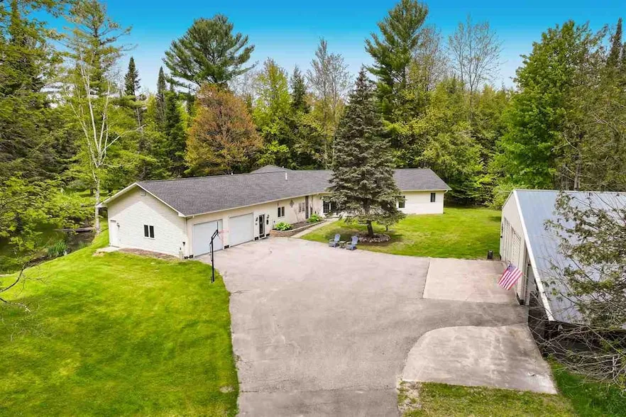 Looking for a getaway near Lake Bellaire where you can enjoy natural surroundings, elbow room & ample storage? This 4 bedroom 2.5-bath ranch-style home offers seclusion while being close to year-round recreation & the charming village of Bellaire. On 14.6 acres with spring-fed pond, streams, & surrounded by trees, this property provides privacy in a park-like setting where you can enjoy nature. Nicely updated, the home is efficient to run & move-in ready. The living room features abundant space, natural light, & views of the pond. It has space for relaxing, dining, or entertaining at the wet bar & full-length deck just outside. The spacious island kitchen offers granite counters, plentiful storage space, pantry, dining area, & lovely pond views. Much of the home features easy-care laminate flooring. A 1/2 bath & utility room are located conveniently by the garage. The layout provides space & privacy as the primary bedroom is separated from the guest rooms in two wings of the house. The primary suite easily accommodates a king-size bed & offers access to the deck where you can enjoy your morning coffee. The ensuite bath includes 2 vessel sinks, shower, & separate jetted tub. The guest wing has 3 bedrooms, one has been a media room, 3 4 bath & access to the sunroom. An attached oversized 2-car garage provides space for vehicles & immediate storage needs, while 2 pole buildings(32'x40' & 42'x 60') offer additional space, including four bays in the larger building. To offset expenses, consider offering boat or RV storage. The home is efficient to run, with a roof less than two years old & plentiful insulation. Forced air heat & central A/C make it comfortable. Enjoy the park-like setting where you can enjoy the company of your friends. Imagine, access to Grass River, Lake Bellaire's public launch, Clam Lake, Torch Lake, Shanty Creek Resort, & seven public golf courses are all within 15 minutes of home.
