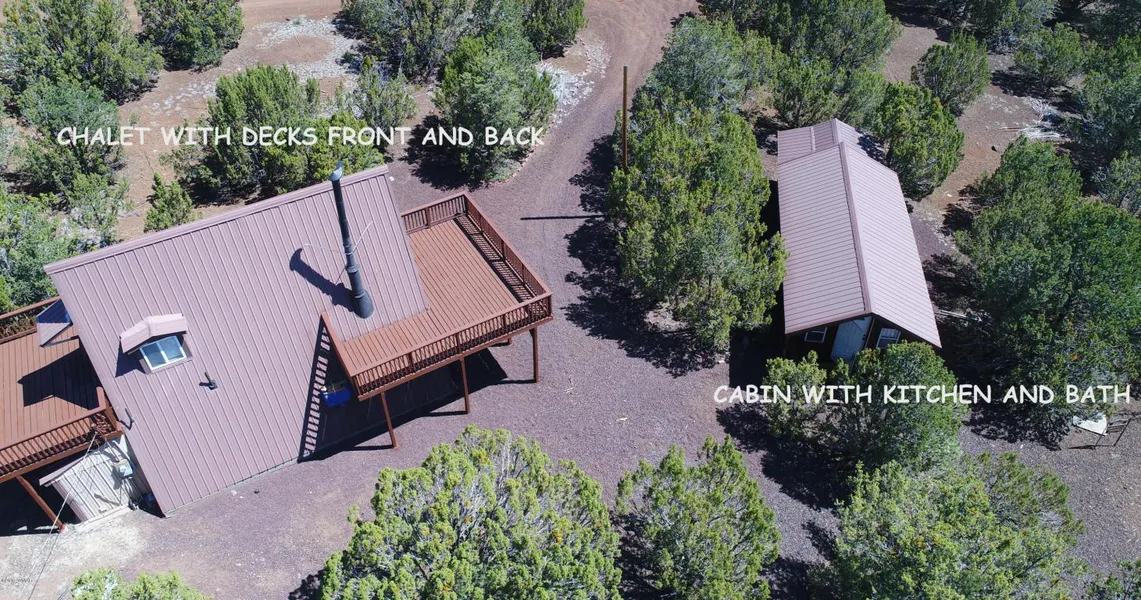 Price reduction!! Very secluded family compound with a chalet and a second separate cabin, as well as a third hobby, craft or workshop room. Power and water to two of the cabins-- kitchens and bathrooms in the two main cabins, power only to the 3rd little craft/utility building. On 1.17 acre of treed property with views from the front and back decks on the Chalet. Master bedroom on main floor of chalet. Two a/c units in the chalet and one is for heating also. Being sold furnished. Enjoy riding quads, bring the horses, and enjoy the night skies from this gorgeous rural setting. Close to town for shopping and amenities. Dirt roads are good and county maintained for easy access. This can be financed, all of the utilties for the 3 units are on one meter.