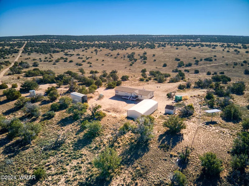 Off Grid Paradise at 6500 feet! Original owner. Great opportunity to own 120 acres w/panoramic views! The east boundary of the property is the Indian Reservation. 80 fenced acres. Self-reliant, like-minded but distant neighbors. 600' well w/clean water. Giant diesel generator for charging batteries, pumping water out of well into storage tank & back-up power. Wind, solar & generator power, Greenhouse, Covered RV Storage, RV hook-up, 80+ mile views, you can see the night skiing lights on Sunrise Ski Resort. Enjoy watching the stars & satellites on the back deck. Far enough out to enjoy a peaceful experience, close enough to get everything you need. Easy shopping at Bashas' in Sanders 35 min & Gallup, NM. 1 hour drive. Call to schedule a showing today. Well Built 20 yr old Manufactured home, the original owner-contractor concrete foundation, Garage, Solar building, Greenhouse. Seller will put new Lithium Batteries and tune-up with an accepted offer. The property is an off-grid peaceful paradise at 6549' elevation. Home faces