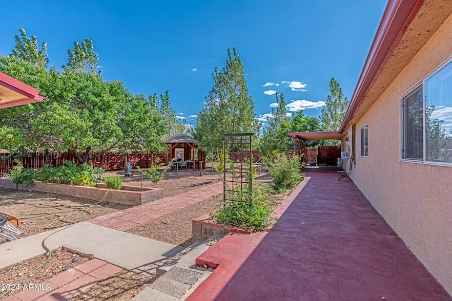 Discover this unique property offering the best of both worlds: a serene, spacious environment with over 2 acres of land and in town. This charming residence is built for efficiency & durability, featuring sturdy concrete walls, a long-lasting metal roof and a owned SOLAR SYSTEM. Designed with both comfort and function in mind, it's an ideal home for those seeking a balance between nature and practicality. The property is surrounded by mature trees, including several fruit trees, creating a lush, private oasis for your enjoyment. Whether you're a gardening enthusiast or just love the idea of fresh fruit right from your backyard, this space offers plenty of potential to expand on the natural beauty that's already thriving here. Beyond the trees, the expansive lot holds great potential for residential or commercial development, making it a versatile investment opportunity for the future. Step outside to the large, fenced backyard, perfect for your furry friends to roam safely. Within the yard, you'll find a beautifully designed gazebo, providing a peaceful spot for relaxing, entertaining guests, or enjoying your morning coffee while soaking in the tranquil surroundings. For those with multiple vehicles or hobbies that require extra storage, the oversized three-car garage is a standout feature. In addition to the garage, there's an attached shed, perfect for tools, lawn equipment, or even a workshop space. And if you love to travel, the RV hookups make this property ideal for RV owners who want the convenience of parking and staying right at home base. Accessibility has been thoughtfully incorporated, with a handicap-accessible ramp through the back porch, ensuring easy entry for all. This home combines practicality, comfort, and a wealth of opportunity with its blend of modern convenience and outdoor space. In addition, bedroom 2 offers its own full bathroom, the primary bedroom offers a sitting area or office (not pictured) and off the living room leads to the Arizona room that has access to the covered patio. Whether you're looking for a peaceful residence, a potential development site, or both, this property is a rare find with endless possibilities.
