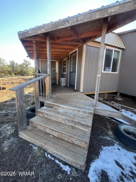 AS-IS off-grid home with strong infrastructure and future on-grid potential (power lines approx. 1/4 mile away). Nearly finished bathroom includes standing shower, installed toilet connected to permitted septic, full electrical, and storage loft. Bathroom plumbing is complete and plumbing for a stackable washer/dryer is ready for hook-up. Features two loft bedrooms, one with storage-stair access, plus a wood-burning stove for cozy winter living. Gas stove and refrigerator convey. Property comes with current solar panels a solar shed for equipment, concrete generator pad ready for a Generac, and a 2,600-gallon water storage tank. Great opportunity for off-grid living with room to finish and add value.