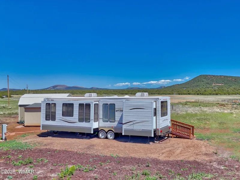 Mountain Retreat - Improved Acre+ Lot with Utilities and Panoramic Views. This 1.16-acre property is the perfect setup for your dream cabin, RV basecamp, or weekend getaway. Located in the cool mountain air, the lot offers sweeping 360-degree views, a freshly laid cinder driveway, and is already equipped with water service, septic, and electric power. The sale includes a 12x12 ramada, a 12x12 wooden tool shed, and a spacious 10x20 covered deck with a handicap-accessible ramp. These improvements provide a strong foundation for immediate use or future expansion. Whether you're looking for a private retreat, a full-time residence in the pines, or a future vacation rental setup, this property is ready to go-no need to start from scratch. Infrastructure is already in place, saving time, cost, and hassle. The 26' guest trailer, power-equipped she shed, and park model mobile home are not includ...