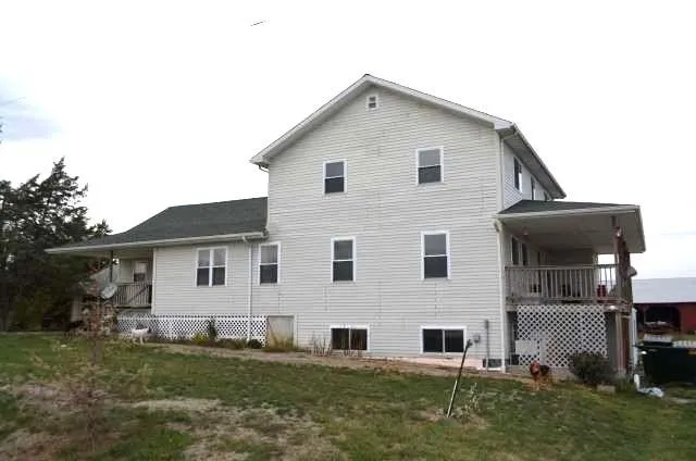 Large 4 bedroom home sits on 9.5 acres with many outbuildings and large pond with scenic oak trees, great place to fish and water for livestock. Home has a walkout basement. Home has large living room with vaulted ceilings. Open floor plan with large kitchen and dining area. Bathroom on main level and on 2nd floor. Acreage would make a nice horse farm. Farm has older barn, newer steel building and an older machine shed. Home as a large covered porch on the east side of the home and an 8X10 covered porch on the south side of the home.