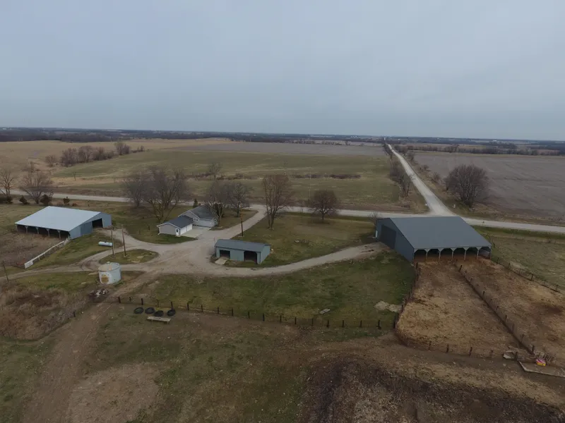 2 bedroom 1 bath home,2 car attached garage, newer 65x70 pole shed with additional 26x40 and 52x74 outbuildings. sitting on 15 acres m/l with additional acres available.