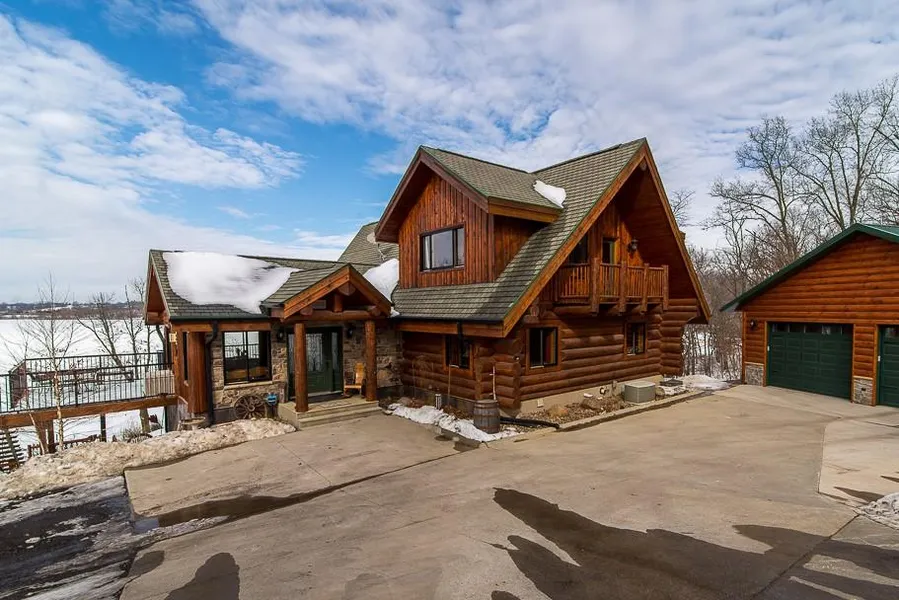 A concrete driveway leads to this landscaped, serene, property with a two-stall heated garage. Several low-maintenance poly decks and a concrete patio are perfect for entertaining and grilling. The centerpiece of the home has a jaw-dropping prow with three story floor-to-ceiling windows offering a panoramic view of the water and stunning sunsets. The open-concept great room features a kitchen, dining area and living room with a massive granite gas fireplace. The kitchen has custom cabinets, a granite-topped island with a sit-up-bar, and a full appliance package is included. Overlooking the great room sits a loft with a private master bedroom suite. The lower level boasts a family/game room area, custom bar, and walks out onto the beautiful spacious concrete patio with a full view of the lake. A meandering path from this lower patio takes you down to your own sandy beach and dock area. Here you can fish, swim, boat, or just bask in the sun and enjoy watching the activity on the lake.