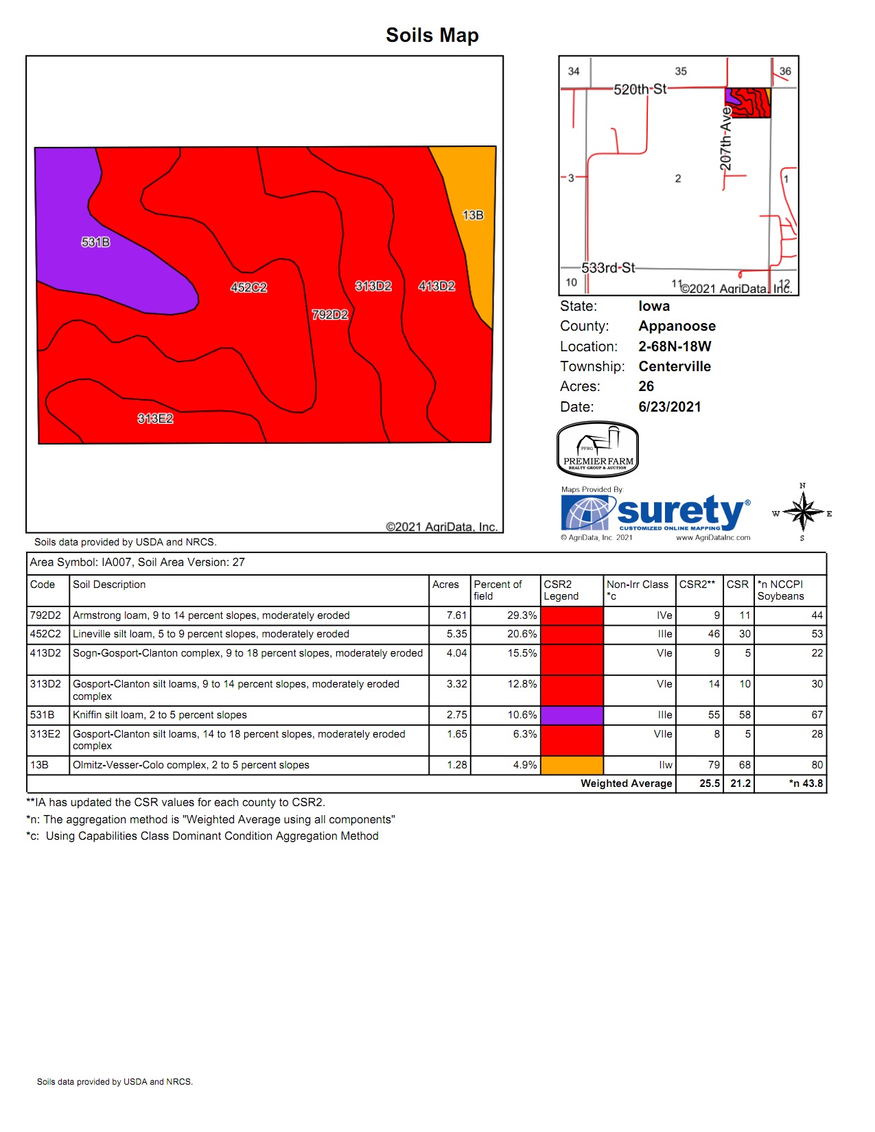 Search for detailed parcel information including; Elevation & Vegetation Maps, Ownership Information, Detailed Parcel Information, Crop History Map, Soil Survey Productivity Data, and more.