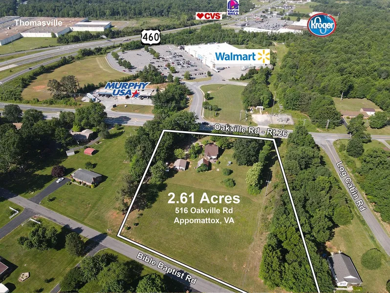 Research Parcel InformationFrom Lynchburg, US-460E to Appomattox. Take first exit to right for US-460 Business/Rt.26. At end of ramp, LEFT on Rt.26. Property on right directly across from entrance to Walmart. To view back of property, continue past Walmart to next RIGHT on Log Cabin Rd to RIGHT on Bible Baptist Rd to property on right.
