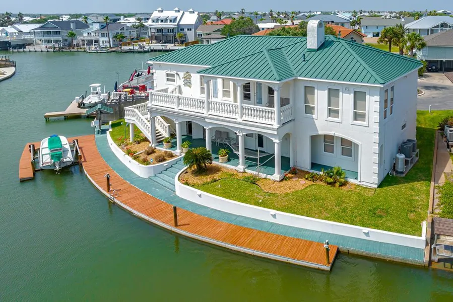Experience grand coastal lifestyle entering this elegant Key Allegro home with well-appointed custom features throughout. 2nd floor great room features huge living room & dining area with wall of windows, doors to balcony, soaring 11 ceilings, intricate crown molding, tile flooring & elevator access. Gourmet kitchen made for entertaining, subzero refrigerator, double ovens, ice maker, huge pantry, granite countertops, center island, lots of custom cabinetry & huge utility room with sink & extra storage. Massive Owners retreat has towering 11 ceilings with forever views of Aransas Bay, sitting area, 2 walk-in closets, walk-in shower, double vanities, jetted tub with accent tile. Upstairs guest bdrm has private bath & offers huge versatile space. Coastal style at its best with first class views & breezes from the upper deck & patio below. 1st flr main entrance with elegant hand carved door...