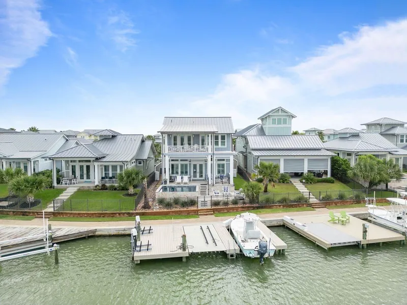 WATERFRONT | POOL | FOUR BEDROOMS | BOAT LIFT | FURNISHED. Welcome to an extraordinary waterfront retreat where luxury and coastal charm blend effortlessly. Perfectly positioned along a premier canal, this beautifully crafted residence offers convenient and fast bay access, timeless design, and a lifestyle tailored for those who appreciate the finer things. Step inside to soaring ceilings, and a sunlit, open-concept layout anchored by a designer kitchen featuring a large island, bar seating, a gas cooktop, and ample cabinetry. Whether entertaining or simply enjoying a quiet morning, every detail has been thoughtfully curated-from the plantation shutters to the soft coastal tones that carry throughout the home. The living and dining spaces flow gracefully to a covered patio, where a sparkling inground pool and inviting fire pit lounge offer the perfect setting for sunset gatherings. A private dock with boat lift and kayak launch awaits just steps away, making spontaneous days on the water feel effortless. Upstairs, the primary suite is a serene sanctuary with its own covered balcony overlooking the canal. The en suite bath features a walk-in shower, dual sinks, and a generous walk-in closet, offering both beauty and function. A versatile bonus space includes a wet bar with wine fridge and sink, ideal for guest overflow or a cozy second living area. Thoughtful extras include an automatic storm shutter system, utility room with sink and built-in cabinetry, a detached garage, and a quaint fenced yard perfectly suited for four-legged companions. Every corner of this home reflects coastal sophistication and livability. With a perfect balance of elegance and ease, this is where everyday moments become unforgettable. The garage is long enough to accommodate a boat! Don't miss the out door grilling and chilling area with grill, sink and fridge. PLUS a work shop in garage!