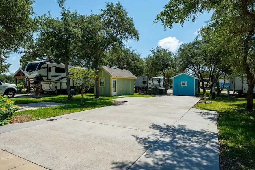 Discover the perfect getaway at Rockport Oaks RV Park, Unit 30- a deeded RV lot with full hookups in the highly sought after Rockport Oaks RV Park community. You'll love the convenience of the double concrete driveways. 1 for your rig and one for your vehicle. There is even a finished out exterior storage building stick-built on site that gives plenty of extra space. The Community boasts a low HOA fee, utilities conveniently in place including city water, community septic hook up and electrical services located directly on the lot. The lot is beautifully landscaped and irrigated. Residents enjoy access to a community laundry facility, enhancing the convenience of park living. Located less than 3 miles from Rockport Beach and even closer to the Cove Harbor boat ramp and marina. This location offers unparalleled access to local attractions and recreation! Lowest priced lot in RORVP