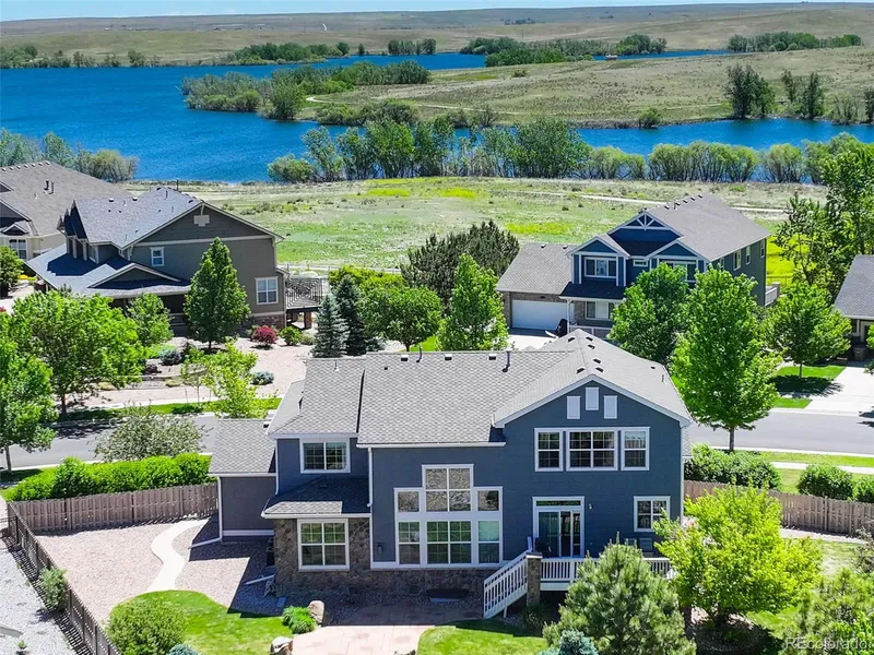 Welcome to this exquisite home in the prestigious Beacon Point neighborhood. With its prime location and views of the Aurora Reservoir, this property offers the perfect blend of luxury, comfort, and natural beauty. The heart of the home features elegant white kitchen cabinets, offering both style and functionality. Plus, there's a large pantry for all your storage needs. Gorgeous hardwood floors flow seamlessly throughout the main living areas, creating a warm and inviting ambiance. On the main level, you'll find a serene living room-a peaceful retreat to unwind, read a book, or enjoy quiet conversations. The dining room is perfect for hosting formal dinners or special occasions. A spacious family room with built-ins and a gas fireplace is designed for comfort and relaxation. The main-level bedroom is a versatile space for guests or a home office. The primary suite boasts a 5-piece bathroom, providing a spa-like experience. Double closets ensure ample space for your wardrobe and personal items. There are three additional bedrooms, one is an ensuite and the other two share the full hall bathroom. The finished basement is an entertainer's dream, complete with a home theater, wet bar, pool table, sitting area, ensuite bedroom with 3/4 bathroom. Outdoor living spaces abound: enjoy morning coffee or lovely evenings on the spacious deck, host gatherings in the beautifully landscaped backyard, or relax on the patio or the welcoming front porch with neighborhood views. With a four-car garage, this home provides ample space for vehicles, storage, and hobbies. Beacon Point is known for its upscale living, serene surroundings, and easy access to amenities. Whether enjoying the reservoir, exploring nearby trails, or simply relaxing, this home offers the best of Colorado living. Don't miss the opportunity to make this executive home yours. Schedule a showing today!