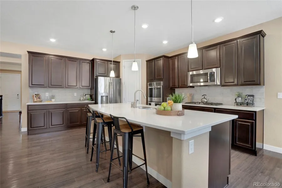Welcome to main floor living with this beautifully crafted home in the highly sought-after Sterling Ranch Community. This ranch style home masterfully integrates main floor living, comfort, and style, offering 3 spacious bedrooms, 3 bathrooms, and an office all on one level. The gourmet kitchen boasts a 5 burner gas cooktop, double ovens, quartz countertops, walk-in pantry and plenty of counter space. The large island is the perfect entertaining space with the adjacent great room. An extra-large primary suite offers a luxurious retreat with double vanities, soaking tub and a spa-like shower. The walk-in closet is a convenient pass-thru to the laundry and mudroom. The unfinished basement presents a 2200+sqft blank canvas for your creative needs, whether it's for entertainment, play, or exercise. The covered deck and patio with fire pit provide a serene outdoor retreat for quiet mornings o...