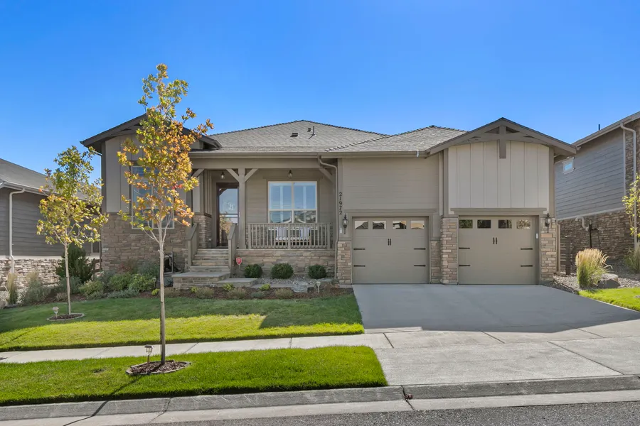 Located in the highly desirable Inspiration Hilltop 55+ community, this stunning turnkey 3-bedroom, 3-bathroom home blends sophistication and convenience with high-end finishes, an inviting open floor plan, and a low-maintenance yard! A grand foyer with soaring 12-foot ceilings welcomes you, leading into beautifully designed living spaces with hardwood floors flowing seamlessly throughout. The gourmet kitchen is a chef’s dream, featuring quartz countertops, stainless steel KitchenAid appliances, an oversized island, designer lighting and custom cabinetry—perfect for entertaining or everyday living. Adjacent, the living room’s gas fireplace and built-ins create a warm, refined ambiance. The spacious primary suite is a true retreat, offering a private seating area, a spa-like en-suite bath with dual vanities, and two generous walk-in closets—both complete with custom organizational systems. Also located on the main level is a dedicated office with French doors as well as a mudroom and laundry room, all inclusive of custom cabinetry for organizational ease. The fully finished basement expands your living space, offering an additional bedroom and bathroom. Outside, the meticulously landscaped yard is designed for easy, year-round enjoyment. Thoughtful xeriscaping, pet-grade turf, a modern firepit, and a covered patio create the perfect setting for al fresco dining and relaxation. The oversized garage provides additional storage and features an apoxy floor. The 11-mile trail system is just steps from your door, inviting you to explore the beautiful surroundings year-round! Enjoy resort-style living with exclusive Inspiration 55+ amenities, including social clubs, community events, and activities curated for an active, fulfilling lifestyle!