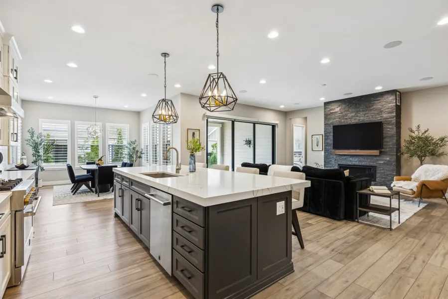 This exceptional property in the highly desirable Solstice community is truly better than new—featuring over $450,000 in upgrades, including $50,000 in professional landscaping, fencing, and two-tier outdoor entertainment areas. With thoughtful design and luxurious finishes throughout, this home delivers the perfect blend of comfort, style, and functionality. The main level showcases luxury vinyl plank flooring, soft designer paint colors, plantation shutters, upgraded light fixtures, and integrated smart home features. The expansive open floor plan includes a gourmet kitchen outfitted with a Bosch refrigerator and Jenn-aire microwave, dishwasher, gas cooktop, double ovens, quartz countertops, under-cabinet lighting, a large center island with seating, and a spacious walk-in pantry. The kitchen flows seamlessly into a bright and inviting Great Room centered around a dramatic 42” gas fire...