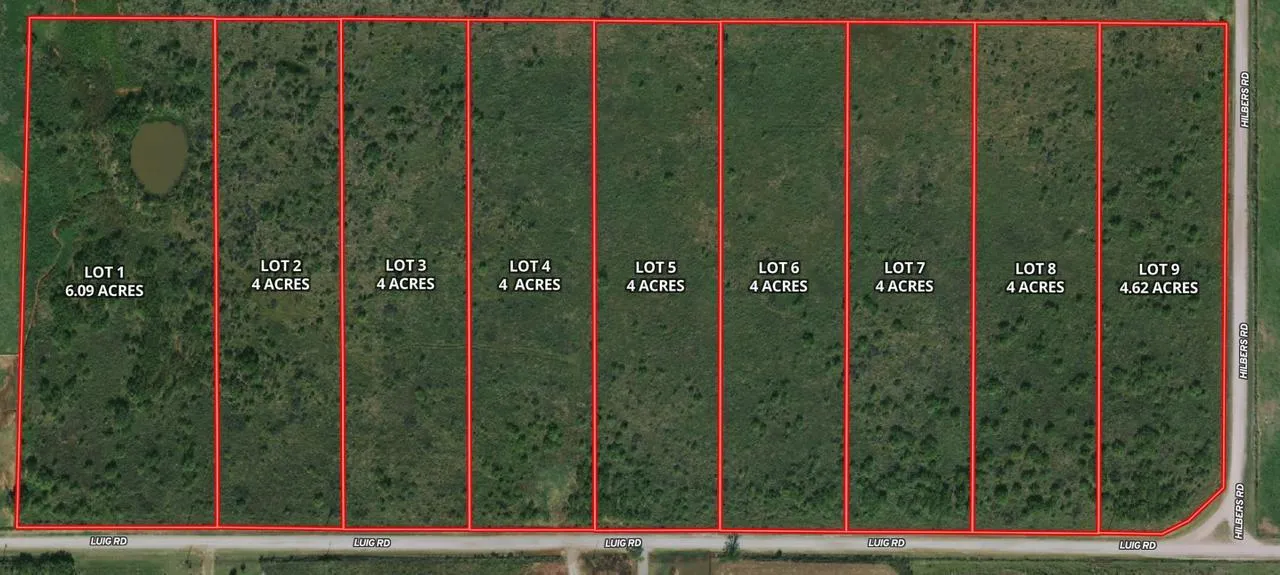 All tracts are individually marked at the center of the road frontage. Orange tape will be at the approximate corners of each tract on Luig Rd.