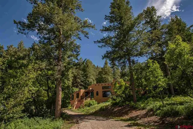 Located on thirteen-plus wooded acres bordering the San Juan National Forest, this fabulous southwest style home offers mountain views, private gardens, lots of outdoor living space and a great floor plan with plenty of room for company. The living, dining and kitchen are open with views of the mountains, tall pines, firs, aspen and a beautifully landscaped courtyard with water feature. The kitchen has granite counters, pantry, subzero refrigerator, double ovens and an operational antique stove. The master suite is on the main floor with access to a private patio. The master bath has double vanities, all granite shower and counters, soaking tub along with a big walk-in closet. Also on the main, you'll find two additional guest bedrooms plus a nice office with access to the courtyard. Downstairs boasts a game room, half bath, laundry and hobby room, lots of storage and an additional flex room that could function as a media or exercise room, bunk room or fourth bedroom. With national forest out your backdoor you'll find unlimited hiking and enjoy watching the vast array of wildlife that frequent the property. This home blends nature with convenience and will delight those looking for a private mountain retreat close to town.