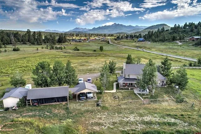 Get relaxed and comfortable in this one-of-a-kind property nestled against the national forest and Turkey Springs with AMAZING PAGOSA PEAK VIEWS! This property offers an automatic gate at the end of the long driveway, a seasonal creek and pond, multiple gated pastured areas ideal for horses, an outbuilding/shed (perfect for hay storage), one-car garage attached to an oversized 3-stall pole barn with feeders/workshop with plentiful storage and electricity, oversized windows throughout the home to allow natural light to shine in, portico patio area just off the dining room, wrap around covered deck (with a gas outlet for gas bar-b-que grill), wood burning stove with stacked brick inlay, additional 2-car attached garage (that is heated with its own heat control), large mudroom/laundry room from the garage into the main home with a utility sink and closet/pantry, large great room, open kitchen with large island and built-in desk area, multiple lounging areas both inside and out (including a deck off the master bedroom). Additional upgrades that can be appreciated are granite countertops in the kitchen, oak cabinetry in kitchen and oak hardwood flooring throughout the main level, main level office/flex space, starlink internet, built in coffee area/wet bar in the master bedroom with granite countertop, jacuzzi tub with a separate shower in the master bathroom, white quartz countertop in the full bathroom upstairs, half bath on the main floor for your guests, and oversized closets and a new huge, neighborhood playground for your kids or grandkids to play on....within walking distance!
