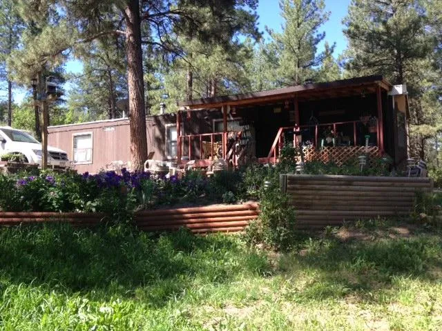 Great 1.1 acre property that backs up to the National Forest. This nice mbl home is situated neatly among the pines. Wonderful property for the hunting enthusiast, step out your front door to access the National Forest. The property also has 2 1800 gal. cisterns, and a very nice out bldg with a loft area.