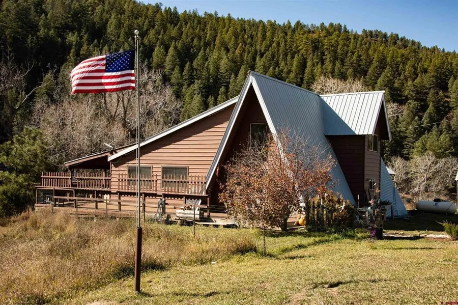Nestled on 16.8 acres, this amazing and unique riverfront property backs up to the San Juan National Forest and has 1,900 feet of river access. You will never tire of seeing all the wildlife including deer, elk, turkey and much more. This quiet and serene property is only ten minutes to the town of Pagosa Springs. Featuring an A-Frame home which has had many updates including new windows and doors, installed in 2023 as well as new flooring and paint throughout. A new septic system and a well fed 1,000 gallon water cistern as well as foundation repairs were also completed. Trex style decking has been installed on the deck with a new 11'X27' covered area that overlooks the river and feels like your own private treehouse. The property has several outbuildings with a new garage and loafing shed. The classic 1956 ABC Park Model trailer is included that would serve perfectly as a mother-in-law suite or rental. With a full bath, bedroom, kitchen and living area this beautiful unit has been lovingly restored and updated. A pasture area is available for your livestock and there is ample room for your dream home or addition. If you are looking for a property that offers peace and serenity, with no HOA that isn't in the city, but has easy access to hot springs, dining and shopping in Pagosa Springs, look no further, this is the home for you.