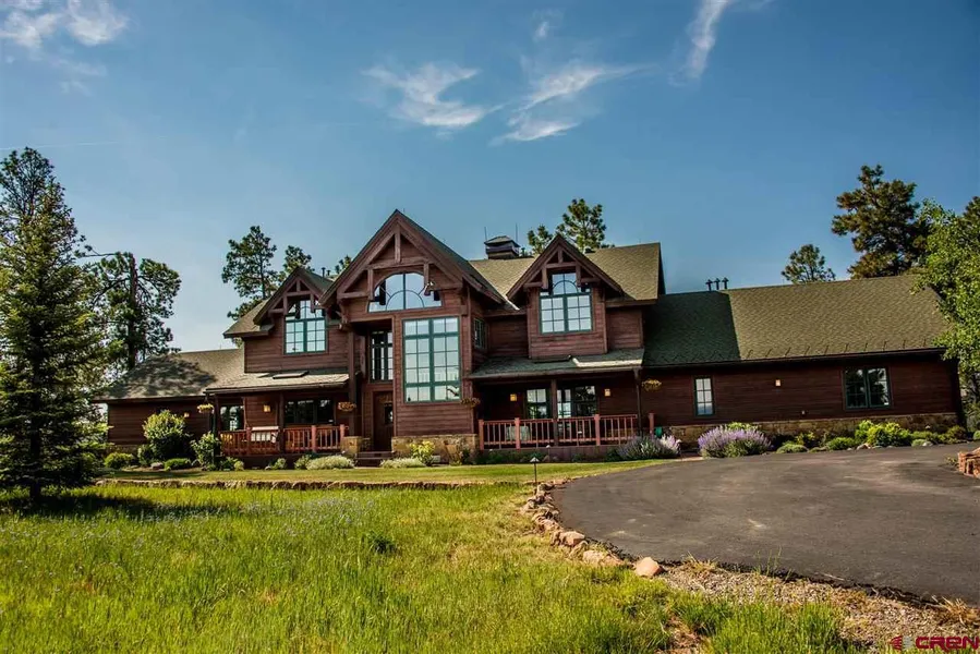 This stunning custom Timber Frame home with stunning San Juan Mtn views lies on 57 beautiful gated acres in Echo Canyon Ranch. This 4,286 sq. ft. masterpiece offers 4 bedrooms and 3.5 baths, plus 2 private offices. The newly renovated main level master bedroom/bath offers a private seating area, tiled floor, walk-in shower, Kohler soaking tub, large double sink vanity with separate make-up mirror and private french doors leading to exterior Hot Tub and Sauna. The open floor plan is showcased by hardwood floors and exposed reclaimed 1800s era trusses from an old airplane parts warehouse, while the floor-to-ceiling Moss rock fireplace anchors the Great Room. The gourmet kitchen is ideal for a gathering, with a butcher block island and rustic family sized dining table, as is the Copper Top Bar. The home also features a climate controlled wine cellar, Sauna, Hot Tub and 8-zone radiant in-flo...