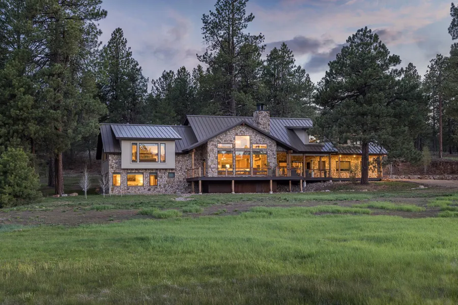 This impeccably designed and crafted modern mountain estate is waiting for the perfect owner to make it a primary home, a 2nd home, or a vacation retreat. Enter along the covered wooden deck, which wraps around the front portion of this impressive 5,325 square foot home. Before you make your way through the front door, you are met with a lovely covered outdoor living space, highlighted by a "Big Ass" fan, hanging from the stunning wood-paneled ceiling, a wood burning fireplace with wood storage niche, trimmed with Telluride Ticino stone. 3 ceiling mounted propane heaters keep you cozy while enjoying the fire or watching TV. As you enter the home, you are greeted by an airy open-concept space, highlighted by large two-story windows, which bathe the area in natural light and offer expansive views of the mountains. Towering cathedral ceilings are detailed with timeless wooden beams and a ru...