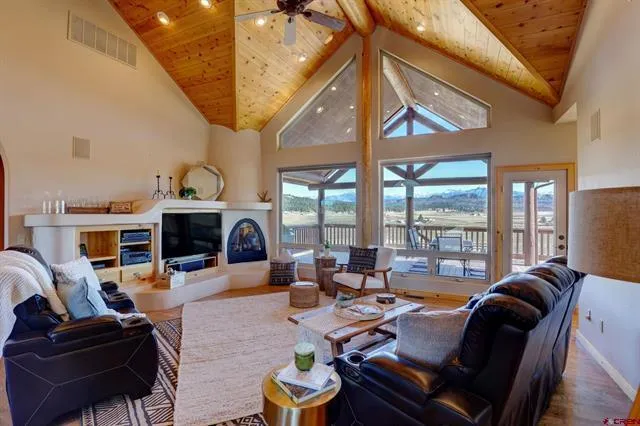 This Sassy Fusion of Rustic Mountain Timber frame and SW Flavors on just under 13 private acres, comes fully furnished and is only 5 short miles to Historic Downtown Pagosa Springs. Spectacular in your face Mountain Views spanning from Pagosa Peak to the N. and continuing on to the S.E beyond Square Top. The over 1000 sf Garage/Shop with utility sink and floor drain is roomy enough to park 4 cars-2 deep plus the fun mountain toys while still having plenty of storage and workspace. Saddle up and ride your horses right from the pasture and your Off Highway Vehicles right out of your garage and into the open national forest. Circular Drive and Parking was custom designed to comfortably accommodate a Luxury Class A Motor Coach that arrives to a self contained RV set up with Frost Free Water, 30 and 50 AMP Electrical Service, and Clean out. Sprawling single level living with a natural light filled open floor plan and lighted vaulted covered mountain view decks. Three Bedrooms plus an executive office, Two full baths plus a private powder room, laundry with utility sink, and separate entrance flex space. Rich finishes throughout of Solid Hardwood Floors, Slate Entryway, Custom Cabinetry, Grand Vaulted T&G Pine Ceilings with Log Accents and New Stainless Appliances. Chefs kitchen with walk in pantry, island and separate dining. Great room Gas log Kiva style fireplace turns every night into the ideal night. Spacious master suite has a private covered deck, his and hers walk in closets, and bath with dual sinks, jetted tub, and walk in shower. The two Spacious guest rooms located on the N.W wing share a large full bath with double sink vanity. Green efficient recirculating hot water means never having to wait or waste and Geothermal heating and cooling to effortlessly maintain your optimal comfort. An air filtration system provides extra clean indoor air any time of the year. Home is low maintenance luxury and comes complete with Central Vacuum System, Security System and Built in Surround Sound System. This property is comprised of two consolidate lots which may be eligible for a re subdivision providing an additional prime investment opportunity. Each lot in Loma Linda is allowed a main home plus two additional buildings ie garage/shop/shed. Minutes to the Worlds Deepest Hot Springs, Epic Winter Sports at Wolf Creek Ski Area, 3 Million Acres of National Forest, Fish Stocked Live River Waters and Lakes. If this has caught your attention in the least attractive and most in between time of the year, then you're in for a real treat as the seasons change! What are you waiting for? Schedule to see this fantastic property for yourself.