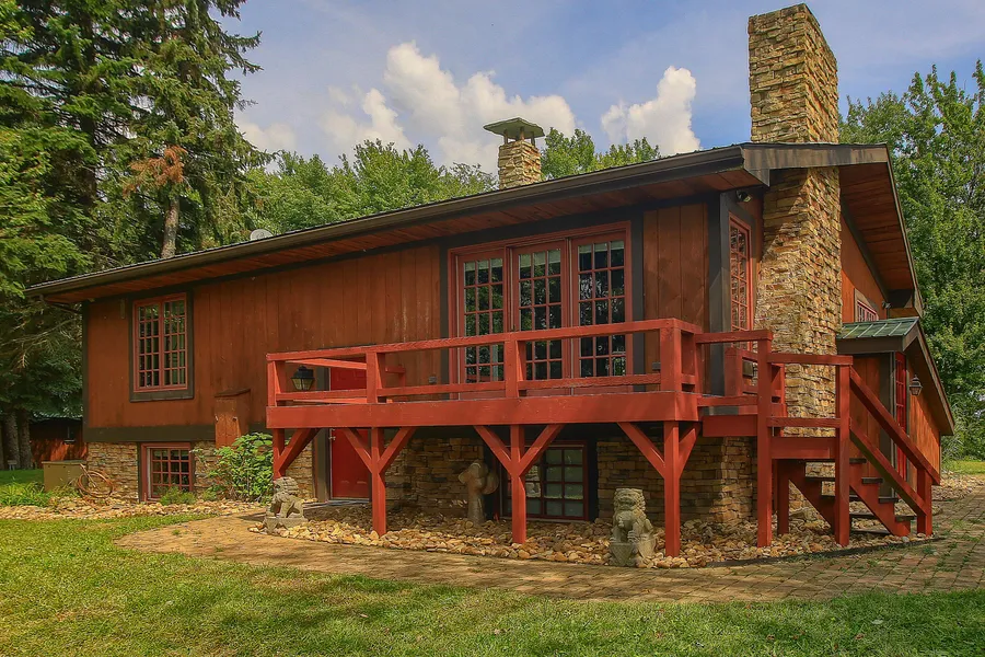 SEVEN STRUCTURES: 2,000 square feet offers two separate private accesses to two living quarters complete with full baths: a main floor bath and master bedroom; and a 2 BR full bath, recessed lighting, and private living space and entry on lower level. A 3-sided Wrap Around Deck overlooks an in ground pool, five stall horse barn with adjoining office; a small barn for chickens or goats, double llama shelter; pool room with added storage in rear; and high tunnel complete the seven structures. Renovate to your hearts delight. The good bones are here. Presented at $449,000.