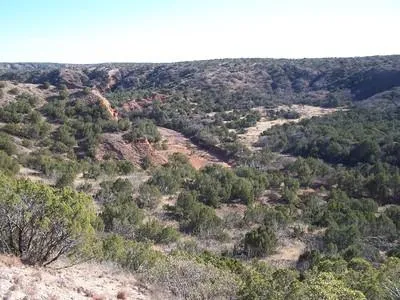 Terrain: The ranch is situated in scenic, very rugged Palo Duro Canyon. Terrain varies from steep ledges and rough hillsides to nearly level bottoms. Overall, topography is considered fairly rugged and mesquite and cedar are common over the majority of the ranch. There are some cleared areas on the property which can be used as foodplots for wildlife. A good network of roads is in place on the ranch. Most all of the ranch can be viewed from these roads and the scenic lookoff points on top of the ridges.
