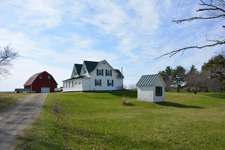 Classic New England farmhouse. 4 BR w/2 bath home with some updates. Features Large Living room, eat in kitchen & dining room. 1st floor bedroom & bath. Big enclosed front porch. 2 bay garage, hip style barn. Awesome views! 8+ acres, apple trees & more..