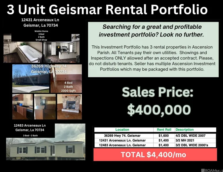 ARCENEAUX RD PACKAGE - 3 PROPERTIES (3 MOBILE HOMES) ADDRESSES: 12431 Arceneaux Ln.; 12483 Arceneaux Ln.; 36269 LA Hwy 74 TOTAL PRICE = $ 400,000. TOTAL INCOME PER MONTH $4,400 OTHER INVESTMENT PORTFOLIO PACKAGES AVAILABLE. • Hwy 621 Package LCADB #42717389 • Bluff Rd Package LACDB #42717226 • Depen Rd Package LACDB #42717655 • A Mobile Home on an acre on Swamp Rd can be purchased as an add-on with any of the packages within for $139,000
