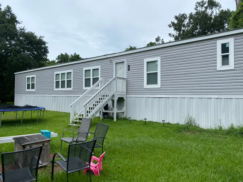 mobile home with 3 bedrooms 2 baths large living area, barn doors leading to kitchen