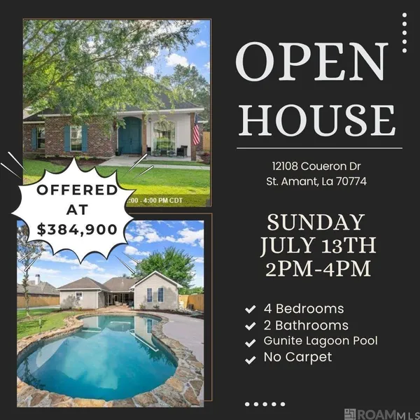 OPEN HOUSE SUNDAY JULY 13TH 2PM-4PM!! Welcome home to this beautiful 4-bedroom, 2-bathroom gem offering 2,000 square feet of comfortable living space, nestled on an expansive 85 x 304 lot. From the moment you step inside, you'll notice the warm wood flooring, custom tiled showers, and a soothing, neutral color palette that complements any style. The open and airy layout is ideal for both everyday living and entertaining. The kitchen and bathrooms feature elegant quartz and granite countertops, while the heart of the home includes a cozy bar area that seamlessly connects the kitchen and living room — perfect for casual gatherings. Enjoy both a formal dining space and a breakfast/keeping area to fit your lifestyle. The spacious primary suite offers a luxurious retreat, complete with a beautifully designed bathroom and generous his-and-her closets. Step outside to your own private oasis! The fully fenced backyard features a wrought iron gate, a sparkling 16 x 32 Gunite lagoon pool, and a covered patio — ideal for grilling, relaxing, and entertaining. The double rear carport and attached storage shed with a garage door provide added convenience. Located in a quiet, one-street neighborhood and zoned for the highly sought-after Lake Primary and St. Amant High School. This is one you won't want to miss — schedule your private showing today!