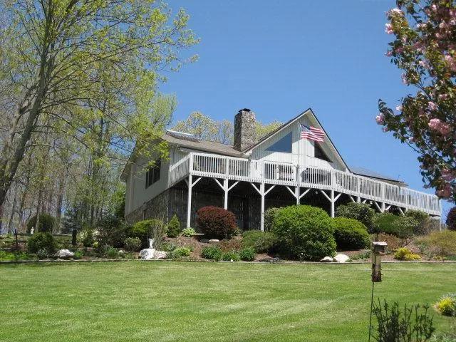LONG RANGE VIEWS come with this wonderfully renovated 3 BR chalet. The first level has wood floors including the cozy sun room. The kitchen cabinetry is Alder Wood with granite counter tops and new appliances. Beautiful wood burning stone fireplace is massive. The lower level has a den, sewing room and rec room with a wet bar, granite counter top and beautiful built in book cases. The lower level floors are ceramic tile. Lower stone patio has a water feature and hot tub. TV theater system stays. The solar hot water system has an electric back-up. Some of the outdoor furniture stays. The landscaping is outstanding and is easy care. There is a nice fenced garden area.The detached 2 car garage has a room overhead. The garage refrigerator stays also. There are two Sun Setter awnings on the back deck and are operated by remote control. Must see to appreciate this home! The solar panels generate power and there is a payback from Blue Ridge Electric and NC Green Power of $75.00 to $150.00 per quarter.