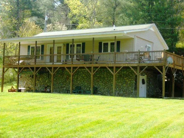 RIVERFRONT HOME: This gorgeous River front home offers all that you have been wanting to come to the mountains for. Theres a gorgeous lawn with lots of beach area for the children and pets to play in the river, great picnic area . Fish , canoe and tube from your own front yard, theres a large rocking porch, drive in basement and a large sundeck. From the porch you can enjoy the river at its best. The home inside is pristine and looks like new. A must see for the family looking for a riverfront home in the mountains.