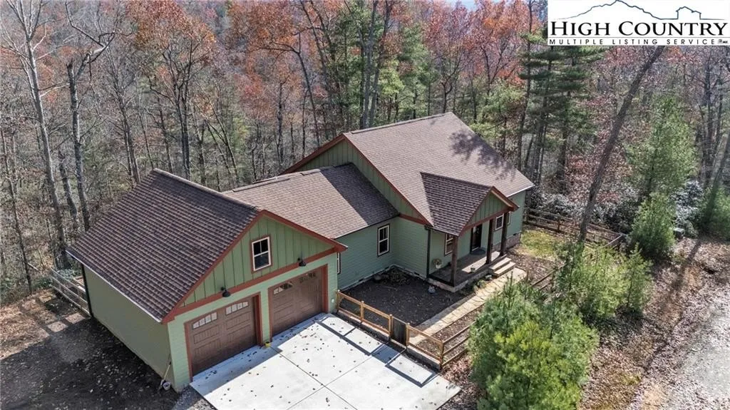 Discover this practically brand-new, move-in ready mountain home perfectly situated on 2.01 acres in the gated community of Brightwater on the New River, just 15 minutes from downtown West Jefferson. Built in 2023 with exceptional craftsmanship and attention to detail, this 2-bedroom, 2.5-bath home blends mountain charm with modern comfort. Step inside to find an inviting open floor plan filled with natural light, highlighting the warmth of the wood trim and high-end finishes throughout. The kitchen features beautiful quartz countertops, a shiplap backsplash, custom cabinetry, stainless steel appliances including a Bosch convection oven with induction cooktop, and a black walnut island countertop, ideal for cooking and entertaining. The kitchen opens to a bright dining area and spacious living room with vaulted ceilings, abundant windows, and access to the covered back porch. The primary suite offers a luxurious en-suite with a custom double-sink vanity, a stunning tiled shower, and an open closet. The guest bedroom also includes a private full bath for comfort and convenience. An inviting flex room provides an ideal space for today’s work-from-home lifestyle, perfect as an office, study, craft or hobby room, or even a small guest suite. A spacious mudroom/utility area serves multiple functions as a laundry, walk-in pantry, and pet-friendly station with space for coats and gear. The oversized two-car garage offers ample space for vehicles and storage, with attic access featuring a wood-truss floor, ideal for future finishing as additional storage or a bonus room. Additional features include a programmable dog door synced to your pet’s collar for easy outdoor access, raised garden beds in both the back and side yards, and a partially fenced area perfect for pets or children (not enclosing the full acreage). Surrounded by mature hardwoods and lush mountain foliage, this property offers peace, privacy, and the soothing sounds of nature. Brightwater on the New River is gated, well-established community with an POA, offering residents access to a beautiful riverfront park – perfect for fishing, floating, or quiet picnic by the water. Ideally located just 5 minutes from New River access, 15 minutes to the Blue Ridge Parkway, 20 minutes to West Jefferson, and 30 minutes to Boone, this location offers the best of mountain living with easy access to nearby towns and recreation. Don’t miss this rare opportunity to own a like-new, custom mountain homes.