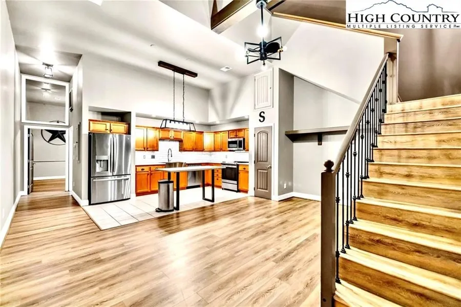 This exceptional condominium offers meticulous maintenance and impressive updates, showcasing pristine move-in condition! Ideal as a primary residence, downtown mountain escape, or upscale rental investment, this property is a "must-see". It boasts large rooms, high ceilings, and numerous recent updates, including stainless steel kitchen appliances, quartz countertops, and a stainless farm-style sink. Additional updates include many new light fixtures and ceiling fans, as well as a washer and dryer. The main level features an open living, dining, and kitchen area with soaring 20-foot-plus ceilings, a large bedroom, and a full en-suite bathroom. The upper level offers a large second bedroom and full bathroom, and a loft-style second living room. This condominium provides level-entry access and "virtual" one-level living, with the kitchen, dining area, living room, primary bedroom, and bathroom all located on the main floor. Additional amenities include new climate-controlled storage units, a game room/fitness room, security cameras, and numerous open-air amenities such as a picnic/grilling area. There are two assigned parking spaces in the main parking lot. The condominium also features a new TPO commercial-grade roof installed in 2022. Conveniently located to enjoy your favorite outdoor activities with the New River, hiking, and disc golf at Ashe Park just a few miles away. Pet friendly w/fenced dog area. Only 1.5 hours from Winston, 2 hours from Greensboro & Charlotte, and 3 hours from Raleigh. Enjoy the convenience of walking to restaurants, shopping, art galleries, and outdoor entertainment that make downtown West Jefferson living so fabulous! Come see today!