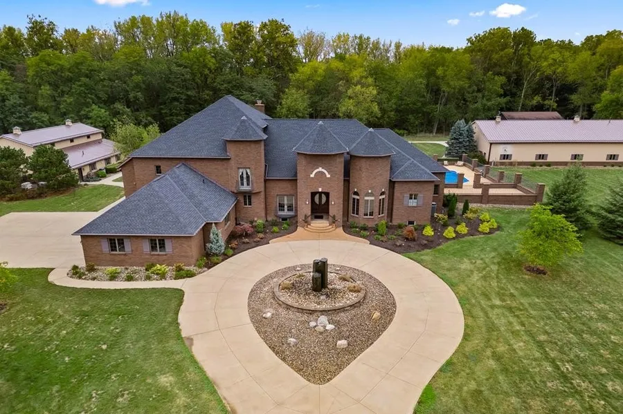 Welcome to your private paradise. Nestled on a sprawling 28+ acres (14 wooded), this exquisite 4 bed, 4 full 2 half bath all brick home offers a lifestyle of luxury and comfort. 6163 sq ft with a grand entryway that flows into living rm areas. Gourmet kitchen w/full island complete w/butler pantry, a sink which allows for effortless entertaining. Master suite boasting a large walk in double tile shower that rivals any spa. Resort style outdoor living w/full side to side screened 3 season rm, inground pool, patio perfect for hosting BBQ's. 3 heated outbuildings. Hobby barn w/kitchen, living rm, bed and bath, perfect for hobbies or guest retreat. Equip barn with 6 overhead doors w/opener. Mechanics/auto barn with car lift. Explore the natural beauty with creeks, cabin, walking path in woods.
