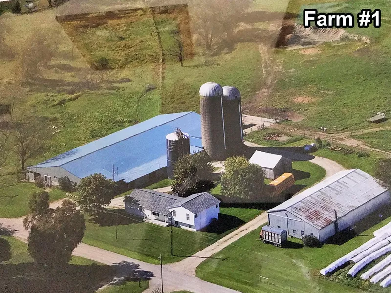 Delaval receiving group, Meuller 800-gallon tank, restroom, 20 x 50 and 20 x 60 Stave silos, 20 x 38 harvester silo