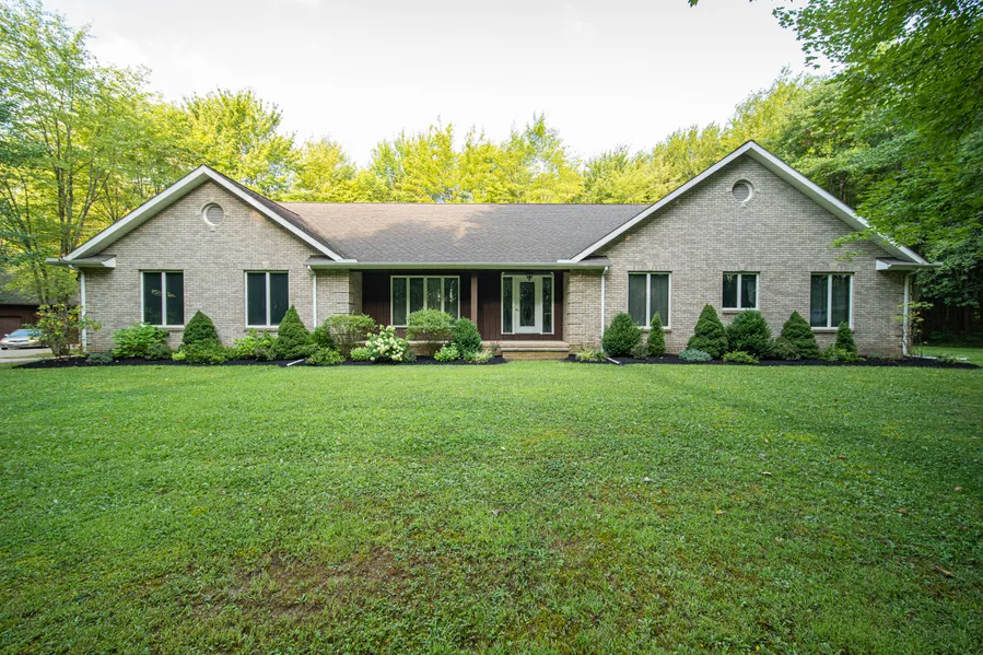 If it's privacy you want, this Stunning Custom Brick Ranch home is right for you! Privacy is yours as you drive down the long driveway back to your home nestled back among a wooded lot of 5.05 acres. The first floor has 3472 sq ft along with a full basement of over 2400 sq ft. Basement already has a custom kitchen. Every detail is custom in this home. Home is all brick construction with coined corners, sandstone keys, and steps, Enclosed porch off of master bedroom is 24x11 custom tile floor with 8x8 Sundance Jacuzzi. Plenty of garage space with attached 27x22-2 car garage,46x30-3 car detached garage w/loft, 16x14 pole barn,divided half for storage n half into 2 kennels for animals w/fenced in area.Foyer includes marble flooring, Sconce lighting, Pease decorative glass front door w/transom sidelights, Kitchen has cathedral ceilings w/2 skylights, kraftmaid cherry cabinets,granite counter...