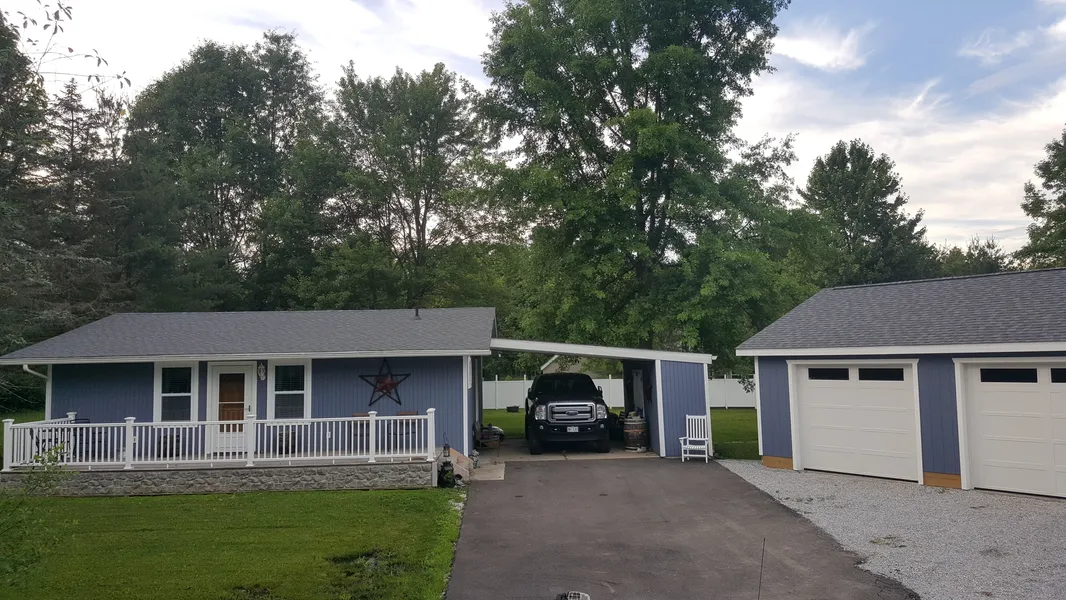 Welcome to this cute ranch home with hardwood floors in living room and bedrooms on a consolidated double lot that is low maintenance. Recent updates include a 24x36 3 car garage, 12x24 shed, attic insulation, paved driveway, and a new crawl space ventilation fan installed. The home is a three bedroom however the middle room has been converted to a laundry room that could be changed back. All appliances stay (2 years old) and all furnishing can be negotiable.
