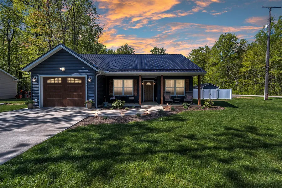 Like new beautiful custom built home constructed in 2018 with 2x6 framing and metal roof. This 3 bedroom, 2 bath unique home was built with attention to detail. Wood craftsman installed all tongue and groove walls, ceiling, mounding and barn doors throughout the entire home. All porcelain tile flooring and custom window treatments. Open concept family room has gas fireplace with custom tv space and storage nooks. White kitchen with mixed hardwood countertops and breakfast bar. Deep copper farmhouse sink and full suite GE low maintenance brushed stainless appliances. Front loading washer dryer closet. The master bath has double copper sinks. Tile shower has built in seat. Full house attic space can be finished. 1 car attached garage can store your golf cart or be used for entertaining or finished. Relax in your private backyard surrounded by a white vinyl privacy fence. Concrete patio, built in fire pit for roasting s'mores and sipping your favorite wine. Brand new matching Amish built 10X14 shed with locking double doors, window and metal roof to store your lane toys and garden landscape tools. Lakefront Township park and The Strip are both easy walking distance. This home is a stunning must see!