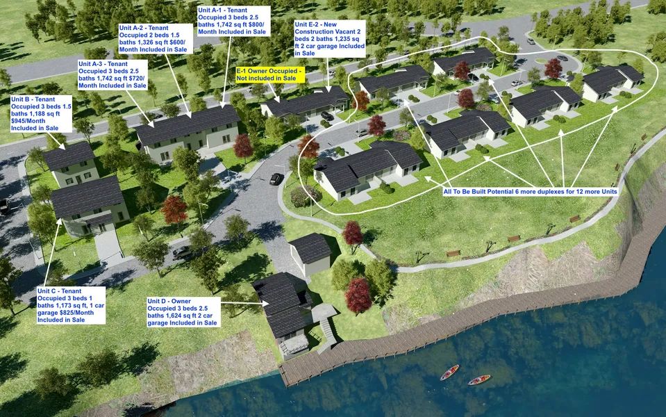 Welcome to Edgewater Estates Condominium Development with 6 acres of water frontage included in the sale! Current rendering shows full potential of current vision but can be whatever you make of this great opportunity. Currently this development offers a new construction duplex (each side is a 2/2 w 2 car garage), a detached 3/2.5, 2 car garage with multiple docks, fully renovated right on the water, a detached 3/1 split level w 1 car garage, a detached 3/2.5 colonial w a full basement and a tri-plex offering 3/2.5, 3/1.5 w basement & a 3/2.5. 5 of 8 existing units have long term tenants month to month, 1 side of duplex is vacant and move in ready, other side is owner occupied and is negotiable but currently not included in the sale, detached condo directly on the lake is owner occupied and included in the sale. Vacant side of new construction duplex and lake front ranch is available to ...