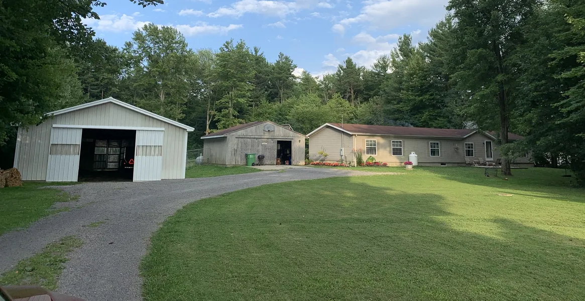 Beautiful Manufactured home with full basement needs electric redone. Electric is thought to be in the walls. Laundry on main floor moved to basement. Master bath still there but now used for storage. Propane available to appliances (Amish home). Open concept LR/DR. Cathedral ceilings. Two large outbuildings for horse barn or storage. Once previously 2-car garage made int barn. Acreage is beautiful.. Wood stove does not stay , thus there is no heat in the house.