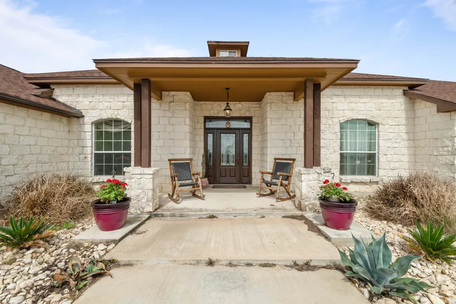 The 3 bed/2 full bath/2 half bath home features a sitting room just off the foyer, dining room, spacious kitchen, living room, laundry/mud room, and separate office. The guest bedrooms connect via a Jack and Jill bathroom. The kitchen, living room, and sitting room all look out on the gorgeous back porch. The master suite opens to an anteroom, then into the main bedroom, and finally into a spectacular master bath complete with a garden tub and sinks that are separated by a shower with a door on each side. The master suite also features a hidden safe room. Flooring includes custom tile and plush carpet. The back porch allows wonderful views of the main body of the ranch. Water is supplied by McCoy water supply, electric by Karnes Electric Co-op.