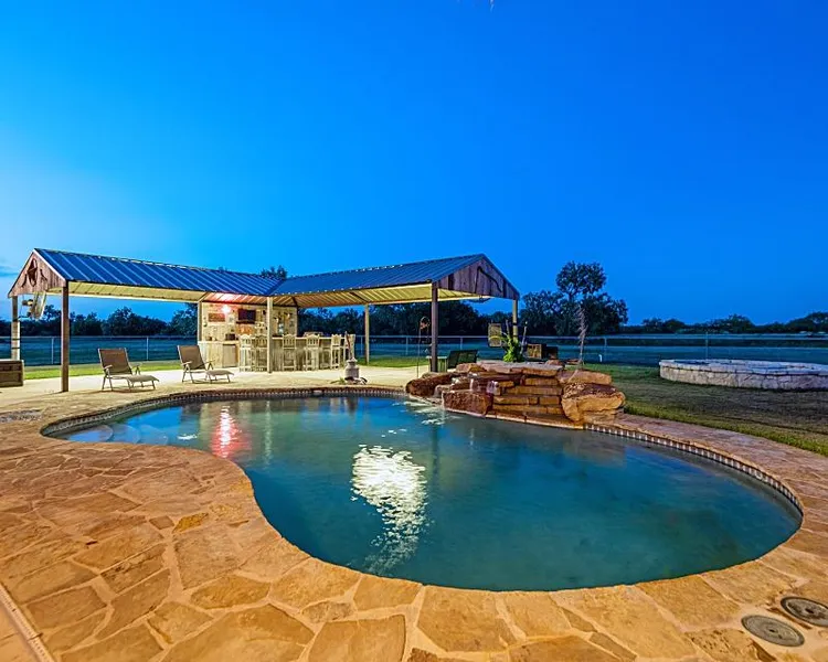 This 177 acre ranch has it all. It is a rare opportunity to own an amazing game fenced ranch like this in Atascosa county. This manicured ranch has everything needed to entertain guests and hunters. It is easy to see the pride that the current owner has taken in this property. From the time you drive into the electric gate and along the paved driveway to the home of the game fenced property, you cant help but appreciate everything about this ranch. The home is approximately 3,000 sq. ft. and is 4 bedrooms and 3.5 bathrooms. This includes the 900 sq. ft. guest suite that is separated by a breezeway between the two. The main body of the home has 3 bedrooms and 2.5 bathrooms. It has an open floor layout that is accented by the beautiful limestone fireplace and vaulted ceilings which only enhance the ranch homes beauty. The suite has 1 bedroom and 1 bath with a living area and small kitchenette. There is also a separate room that is currently being used as an office but would easily convert into another bedroom. As nice as the house is, the backyard is where you will want to spend most of your time. There is a beautiful pool that as well as a full outdoor kitchen, huge BBQ pit, and a wonderful fire ring for sitting around and enjoying the cool winter evenings, watching the sunset, and telling stories about hunting experiences past and present.