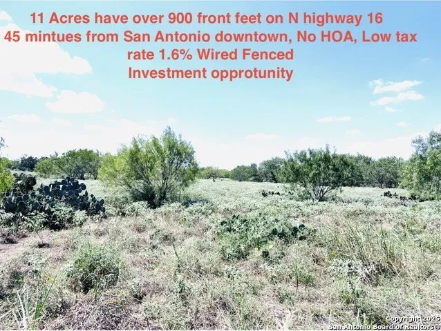 Excellent investment property totaling 11 acres with 943ft of frontage on North Highway 16. Only 18 miles from San Antonio city limits and 45 minutes to downtown San Antonio, this great location lies between Poteet & Jourdanton and allows for both commercial and residential options.