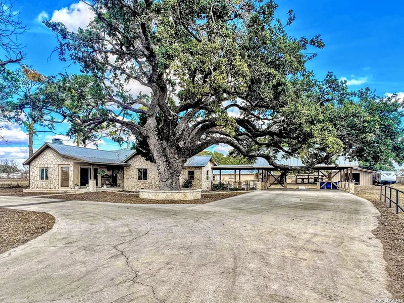 Set on 5.93 picturesque acres, this property offers space, comfort, and so much more! The main home features 2 thoughtfully designed bedrooms and 3 full bathrooms, while a separate guest house provides added flexibility with 1 bedroom, 1 bathroom, a kitchenette, and a private living area, ideal for extended family, guests, or a home office. Inside the main home, you're welcomed into an inviting living room enhanced by vaulted ceilings and oversized windows that flood the space with natural light. The family room flows seamlessly into the breakfast nook and kitchen, creating a layout perfect for entertaining or hosting gatherings at home. The kitchen is a chef's delight, offering stainless steel appliances, a glass cooktop, generous cabinetry, and a large center island with breakfast bar seating. Each bedroom serves as its own private retreat, featuring en suite bathrooms and ample closet space. Outside you will enjoy expansive outdoor living, where a covered patio overlooks the in-ground pool, making it the perfect setting for Texas summers. The sprawling acreage offers endless opportunities. Additional features include a shipping container for extra storage, a three-car carport, a private water well supplying both the pond and sprinkler system, horse stalls, tack room, and a barn with a roll-up door, completing this truly one-of-a-kind property. Schedule your private showing today and experience your own piece of Texas!