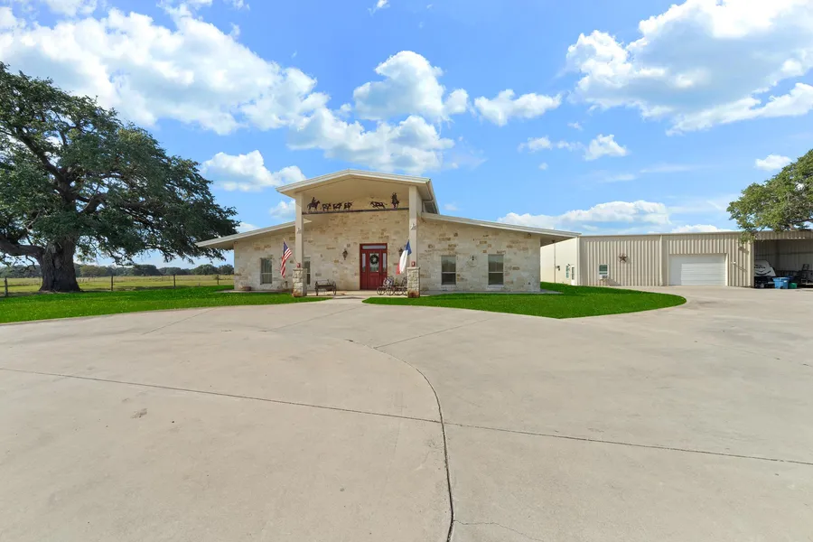 12.35 acres just 25 minutes from the southside of San Antonio and 10 minutes from Pleasanton. This home sits just off Hwy 37 and 97, making a quick shot to San Antonio (25 min) or Corpus Christi (1 hour and 45 min) Quiet, country living at its best with open ranch/farm land on every side. There are NO restrictions on this property! The home was built with commercial grade I beams and supports throughout, to last a lifetime! Doors are commercial size doors that are wheelchair compatible. Large master suite with a sitting area and access to the outside through the study/hottub room (that is attached to master). Living room is massive with about 26 ft high ceilings and plenty of lighting throughout the house! Kitchen has plenty of cabinets for storage and pantry items. Large marble counter tops throughout entire kitchen. Kitchen also has a wet/ coffee bar with wine cooler. Large laundry room with all the storage you could as for. The mud room listed is a dog room with a dog bath on the floor or could be used as a utility wash basin. The study was built to be an inside hot tub room. It has the proper AC setup for a hot tub and a drain in the floor for those purposes. There is an insulated room in the exterior building with potential to be anything you'd like. The shop is 2000sqft with a 1000sqft carport made for an RV with 50 amp electrical hookup and water ran to the back of the shop. The only utility bills paid are electric and garbage pick up due to your own private well with large filtration system and private septic. This is a one of a kind gem built to last for generations!