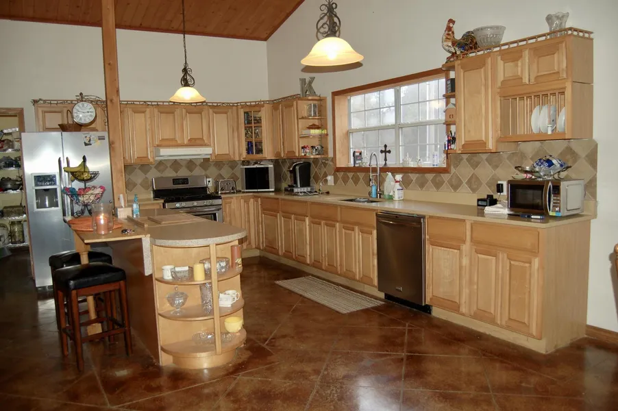 It is not easy to find a clean & comfortable home in this area! 3 bed, 2 bath 2300 sq. ft. metal home. Living room, kitchen, and dining room are all open and spacious with cathedral ceiling. Kitchen is large with plenty of counter space, stainless steel appliances, large window over the sink, tiled back splash and plenty of cabinet space. The utility room is more than just that, it is also used as a large kitchen pantry. Floors throughout are all stained concrete. Huge master suite with walk in closet. Master bath has two separate vanities, jetted tub, and tiled shower. Additional bedrooms are good sized with large walk-in closets. Central heat & air. Your children or grandchildren will absolutely love playing in this yard! There is a darling play house that could also be used for storage. 30 ft. above ground swimming pool. A nice size back porch to watch the whitetail deer grazing.