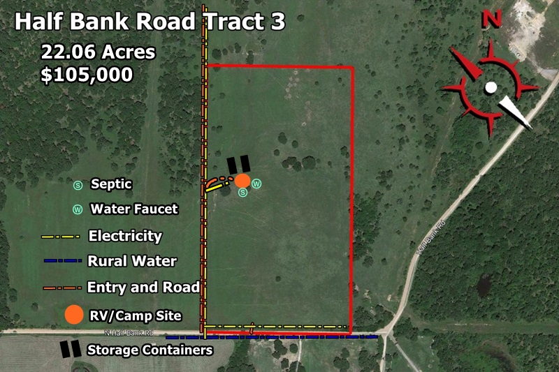 This property is a beautiful 22+ acres that is suitable for a home site, recreational getaway or hobby ranchette. NO HOAs, LOAs and is available for immediate possession. It is made up of mostly open pasture and a few trees. We pushed a new road up the western side of this tract. A county water line is located all along the South Boundary from which a tap, water meter and service line, supply water to the RV camp/build site. A county road is on the South and a private access road is along the West side from which a driveway leads to an area designed for RV camping. This RV/camp site includes an electric service pole, running water from a frost free faucet, two 40 foot shipping containers and an aerobic septic system. A survey has been done and a copy will be provided. This land is 3 miles, as the crow flies, to McGee Creek Lake. Its a 12.4 mile drive from here to the McGee Creek Lake b...
